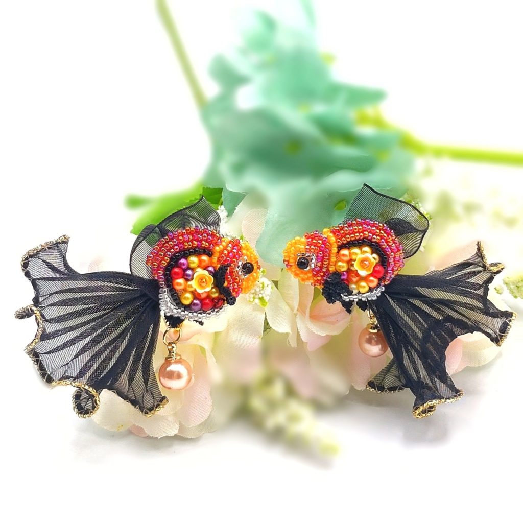 金魚を型どった、ビーズ刺繍イヤリングです。いつもの自分をイメチェンしたい!そんな時に重宝するハンドメイドのイヤリングです。イヤリングですので、軽くなるように素材を工夫し、重さ、片方約3.4グラムです(多少の個体差があります)これぐらいであれ...